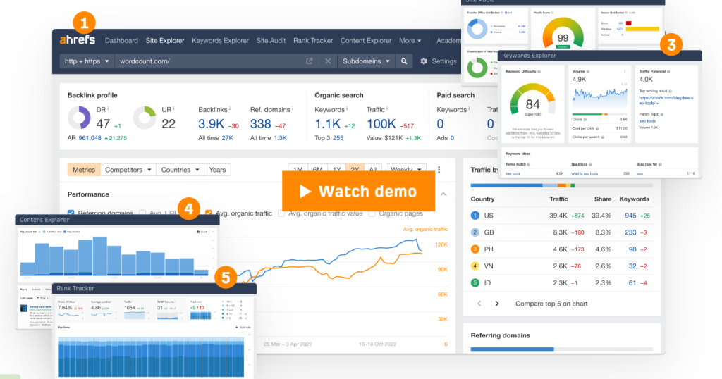 Below is a screenshot from Ahrefs.com homepage, which shows a snapshot of all the matrices and data available once you sign-up.
